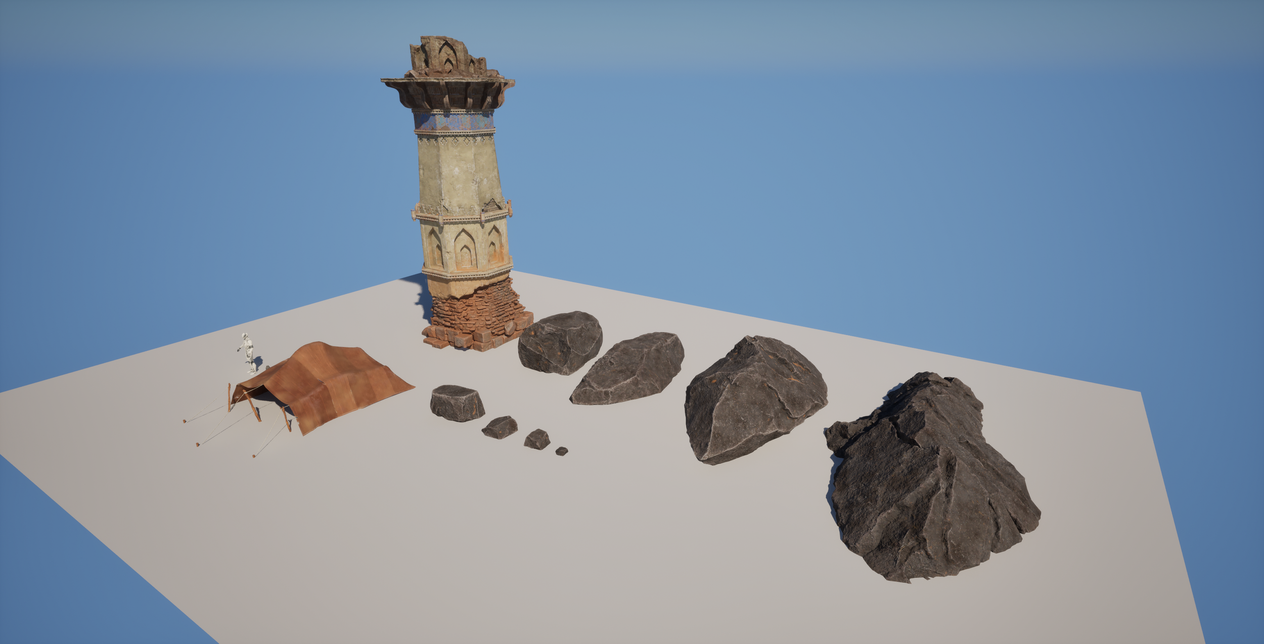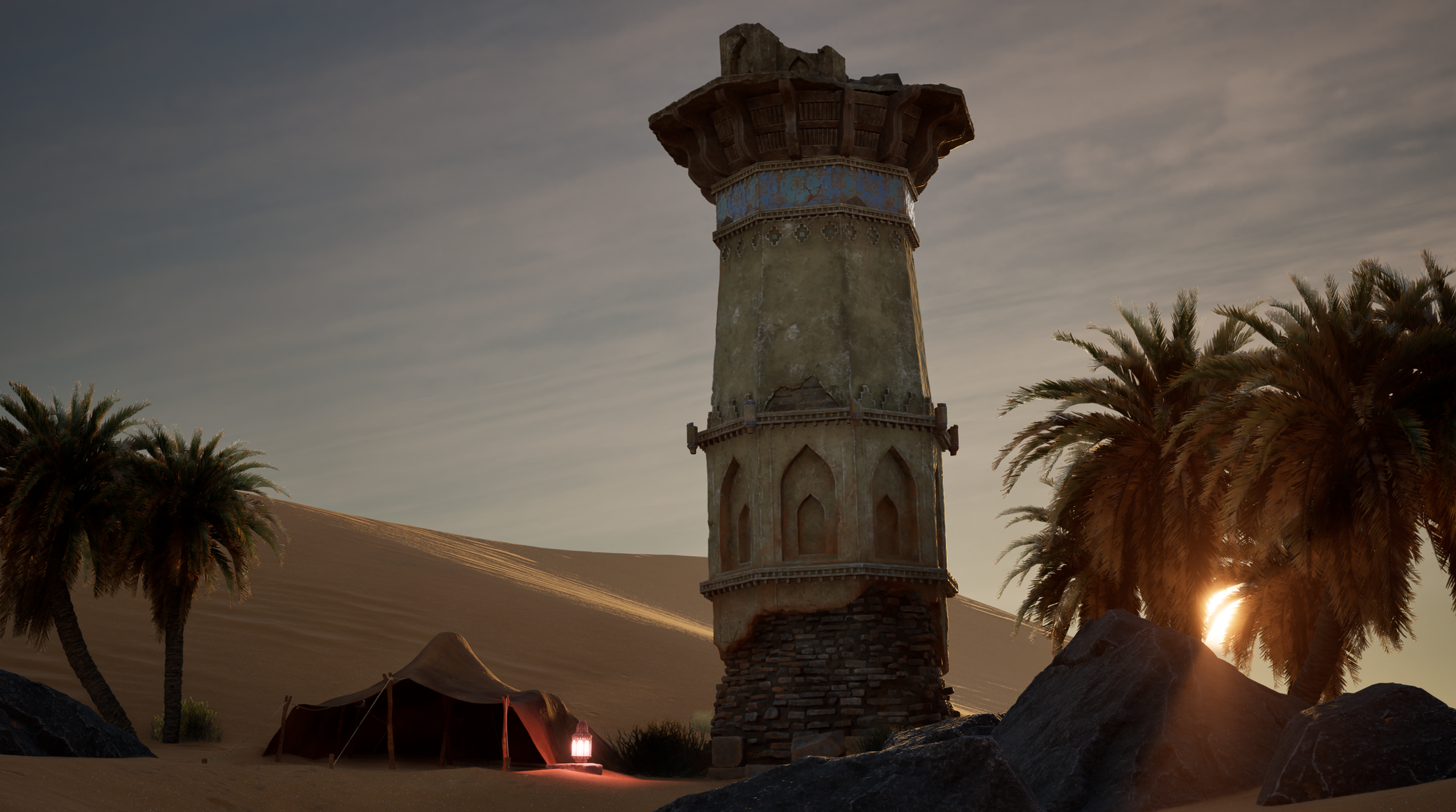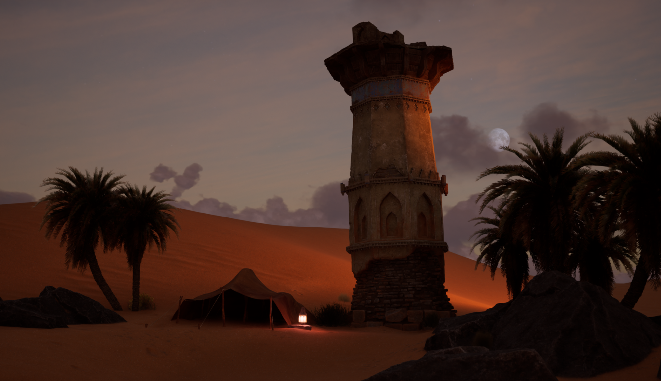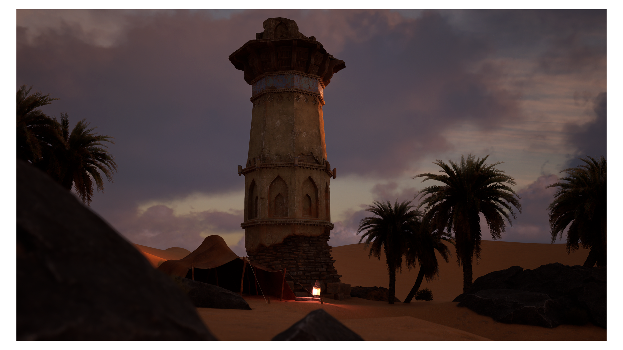 Environment art created in Unreal, inspired by orientalist painters and Islamic architecture. My goal was to create an exterior and use techniques like RGB masks, landscape texturing, and natural lighting. Also a huge thank you to Nate Stephens for his guidance on this project and for sharing strategies and workflows in Zbrush. I created all assets except for the trees and shrubs, which were from ReginaModels.
